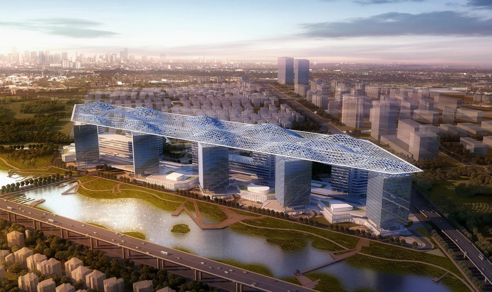 综合体占地82公顷,由国际著名建筑师拉斐尔·维诺里操刀设计,1.5公里的城市产业长廊堪称“世界之最”。项目1至3层采用庭院式建筑风格,用游廊、咖吧、喷泉、空中绿化等,将所有建筑连成一体。每栋楼的屋顶都有着屋顶花园,并由太阳能光伏面板整体覆盖,远看就像一条巨大的云廊。