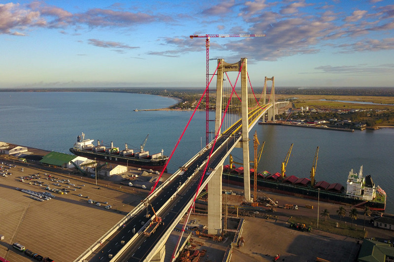 马普托大桥是该桥是非洲大陆跨度最大的悬索桥,由中国路桥工程公司承建,全长约3公里,主跨680米。