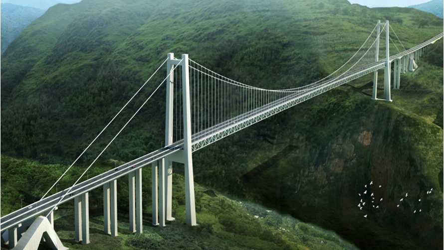 沟通贵阳至瓮安交通要道的重要组成部分,全长2171.4米,主跨1130米,是目前亚洲山区最长的钢桁悬索桥,总投资约15.4亿元。
