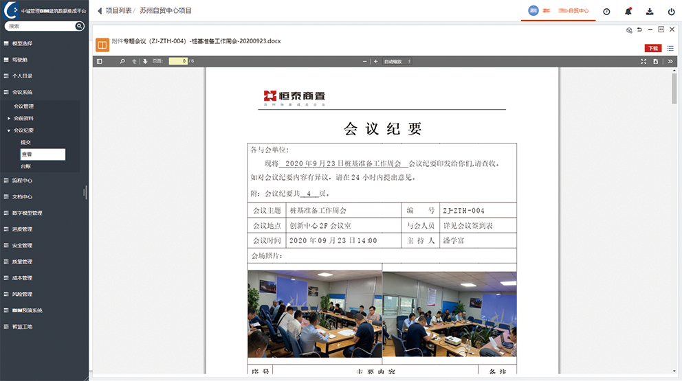 各参建方在平台上进行会议的组织及通知,会议纪要审核通过后,自动归档,并在平台上在线查阅