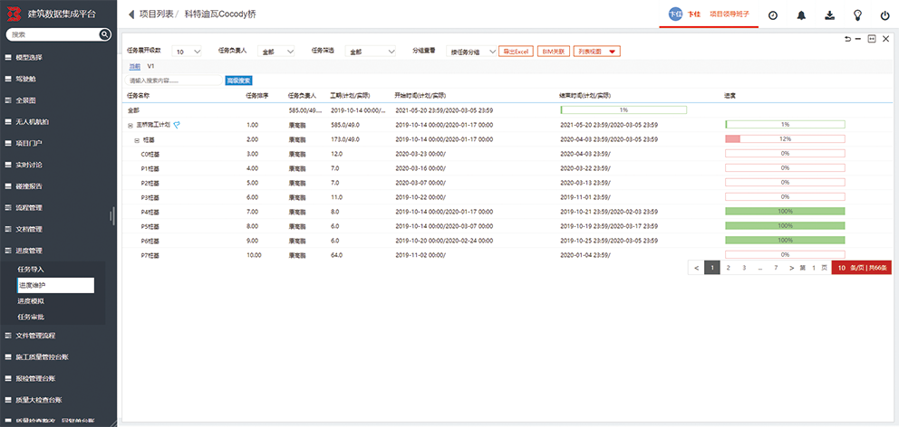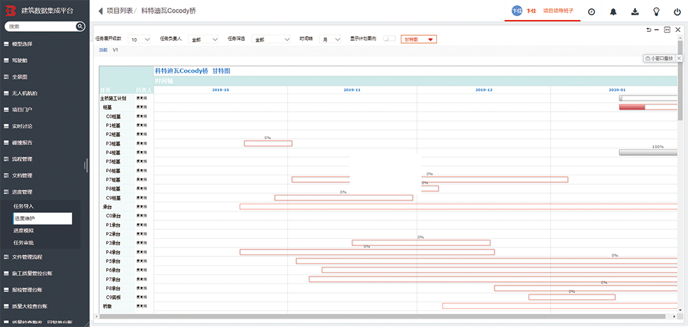 项目中对施工进度的管控通过进度任务上传并挂接模型显示,可以直观的看到建筑施工的现场进度情况,并根据根特图查看每天的进度情况,领导不用跑现场就能了解现场情况。