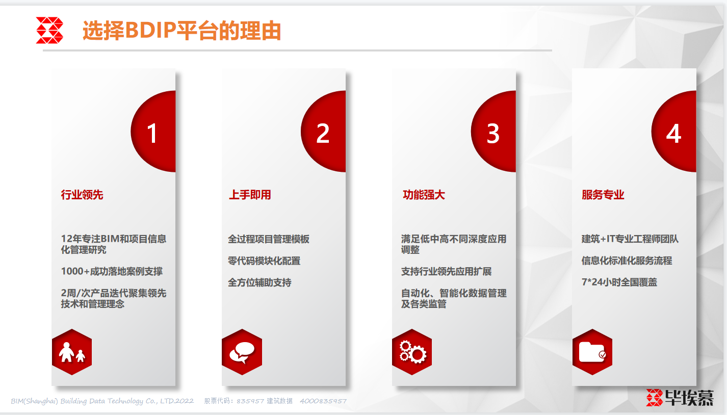 毕埃慕(上海)建筑数据技术股份有限公司(股票代码835957建筑数据)成立于2011年,是一家为BIM而生的公司,中国首批BIM专业公司,中国BIM创业第一股!12年如一日深耕BIM行业,为客户建立统一的BIM实施标准流程,通过运用及开发先进的BIM技术及软件系统,打通建筑行业规划,设计,施工,成本,运维等各阶段数据流动,形成建造全生命周期数据协同作业方式!近年投入的研发费用均达到总销售收入的15%以上。申请的专利、软著和软件产品达四十余项,同时通过ISO9001认证,高新技术企业认证,双高双软认证,承接多项省市级科研课题,获交通部、建设部通报表彰,奖项荣誉覆盖设计,施工,运维全阶段,2016年获美国全球智慧空间与综合基础设施BIM运维管理最佳商业合作奖。与福建省最大两家国企(福建省电子信息集团和福建省建工集团)成立星宇建筑大数据运营有限公司,与青岛动投集团成立青岛动车小镇动投建信科技公司!目前历时8年不断迭代开发的《BDIP建筑数据集成平台》在国内重大工程项目中广泛使用、通过建筑信息化实现项目集成管理,提升效率、降低成本、避免差错、节省费用,使客户获得最大收益!!!