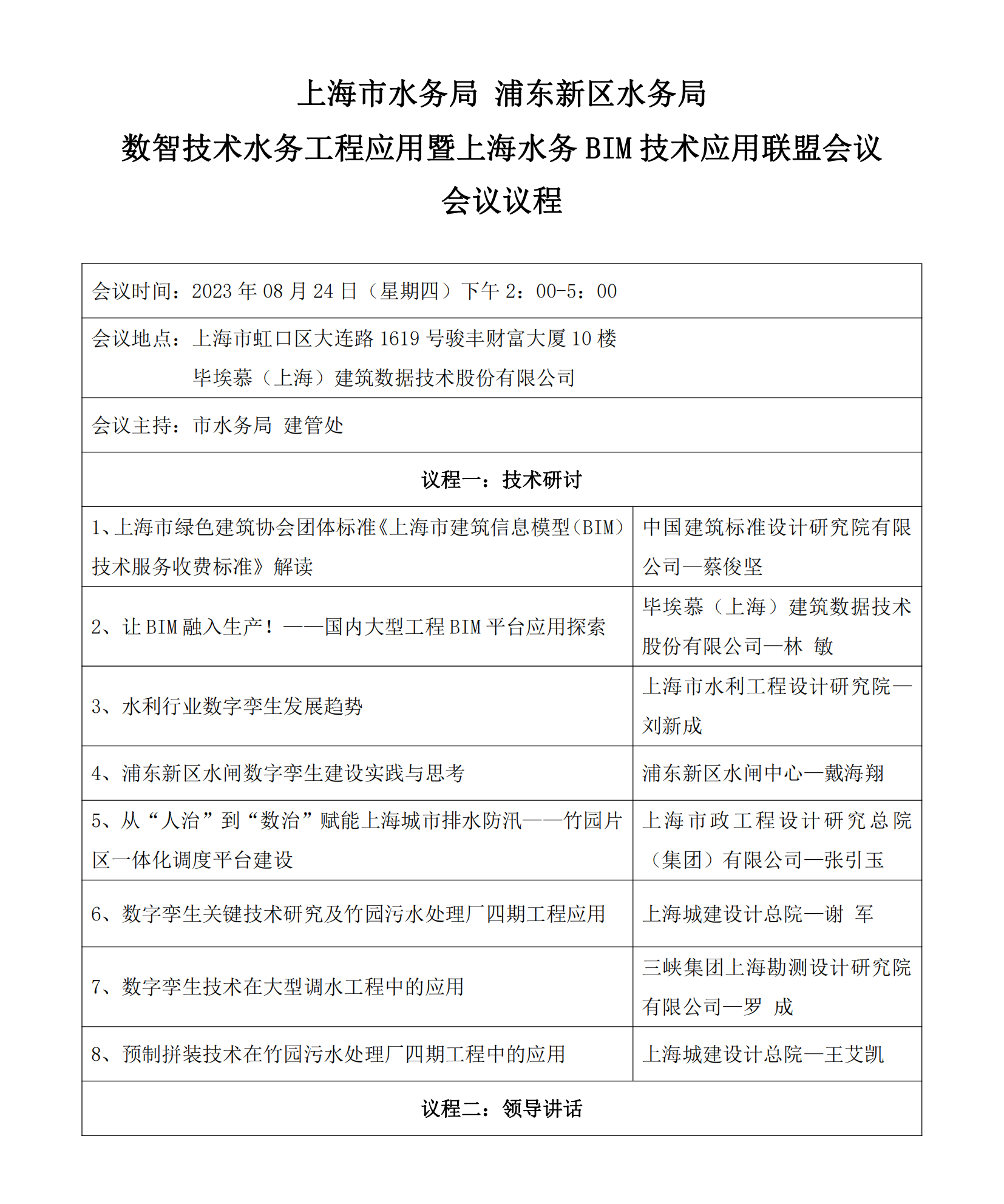 8月24日,市水务局联合浦东新区水务局召开“数智技术水务工程应用暨上海水务BIM技术应用联盟会议”,进一步推动新技术赋能新阶段水务事业高质量发展,全力推进浦东新区引领区水务工程高质量建设。会议在毕埃慕(上海)建筑数据技术股份有限公司举行,市水务局副局长周建国、浦东新区水务局总工张红出席会议。科信处,建管处、市堤防建设中心、水利事务中心、水务安质监站以及上海水务BIM技术应用联盟21家成员单位60多位领导和专家参加会议。
