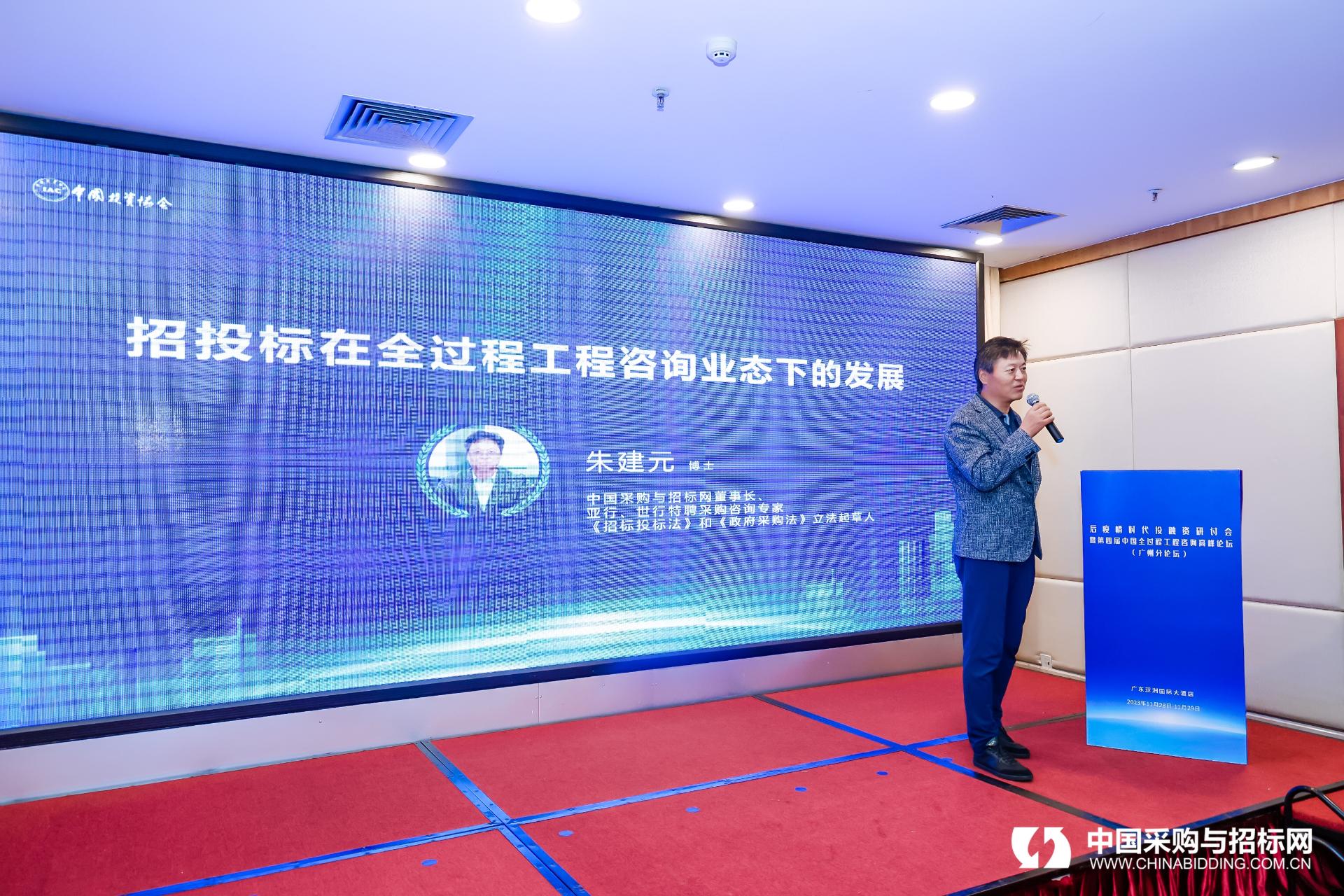 首先是承办单位领导中国采购与招标网董事长、《招标投标法》和《政府采购法》起草人、亚洲开发银行政府采购首席专家朱建元博士致辞。朱博士提出了招标在全咨管理体系中的价值贡献,招投标在全过程工程咨询业态下的发展和以电子招标为切入点推动咨询行业的数字化转型。