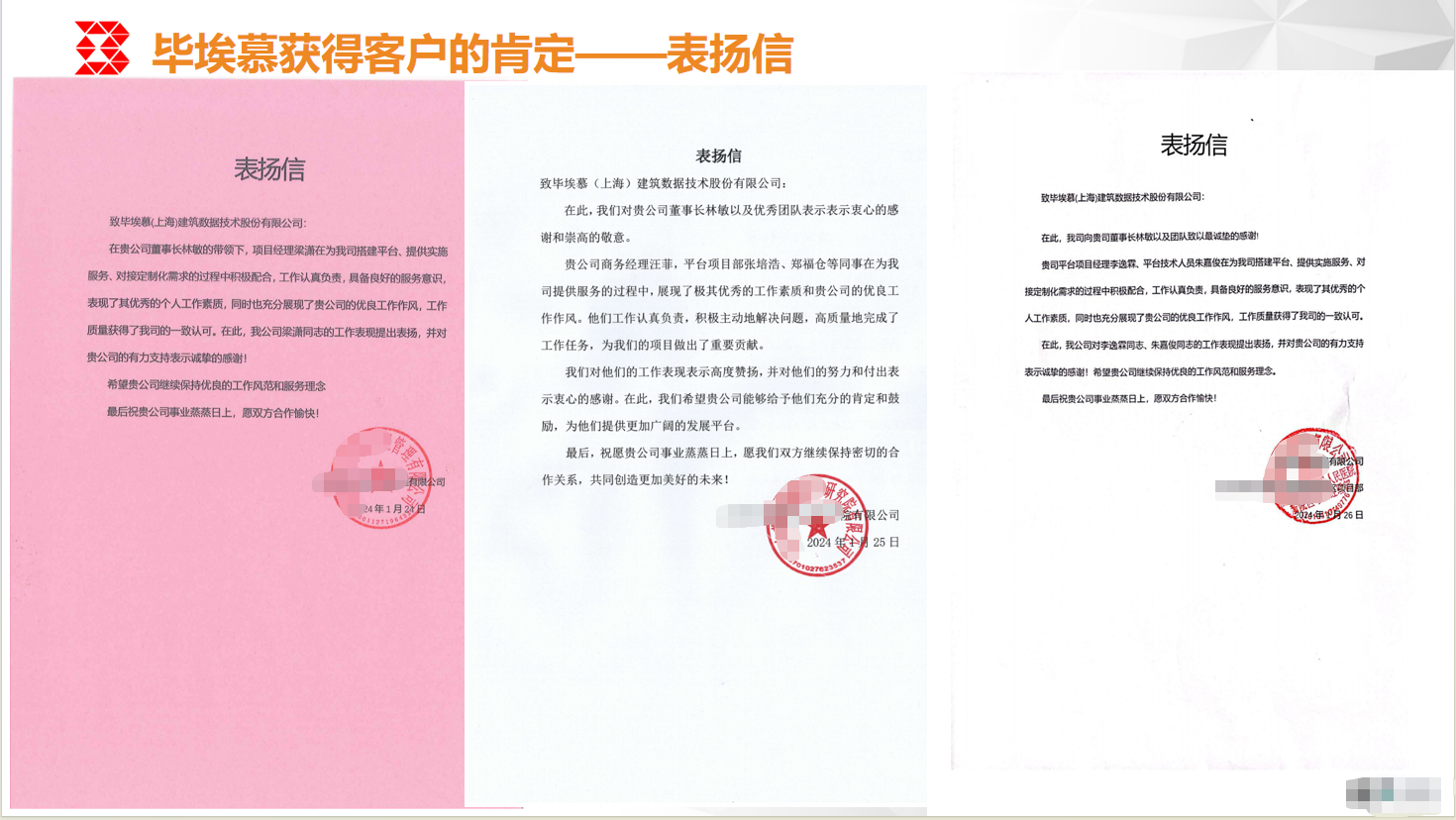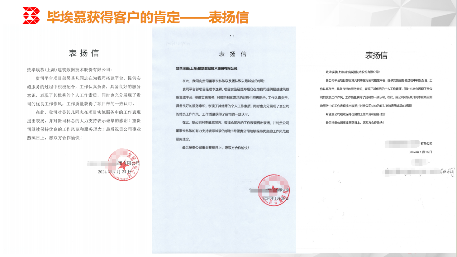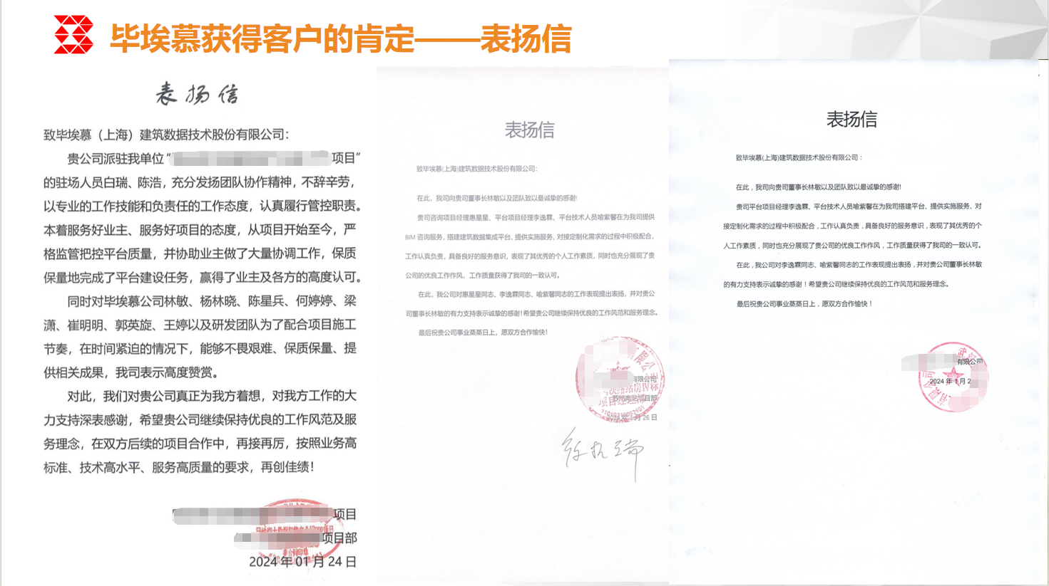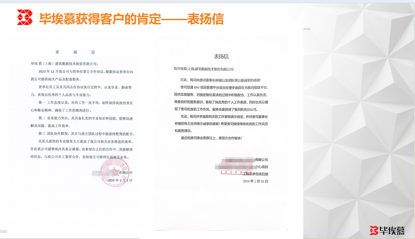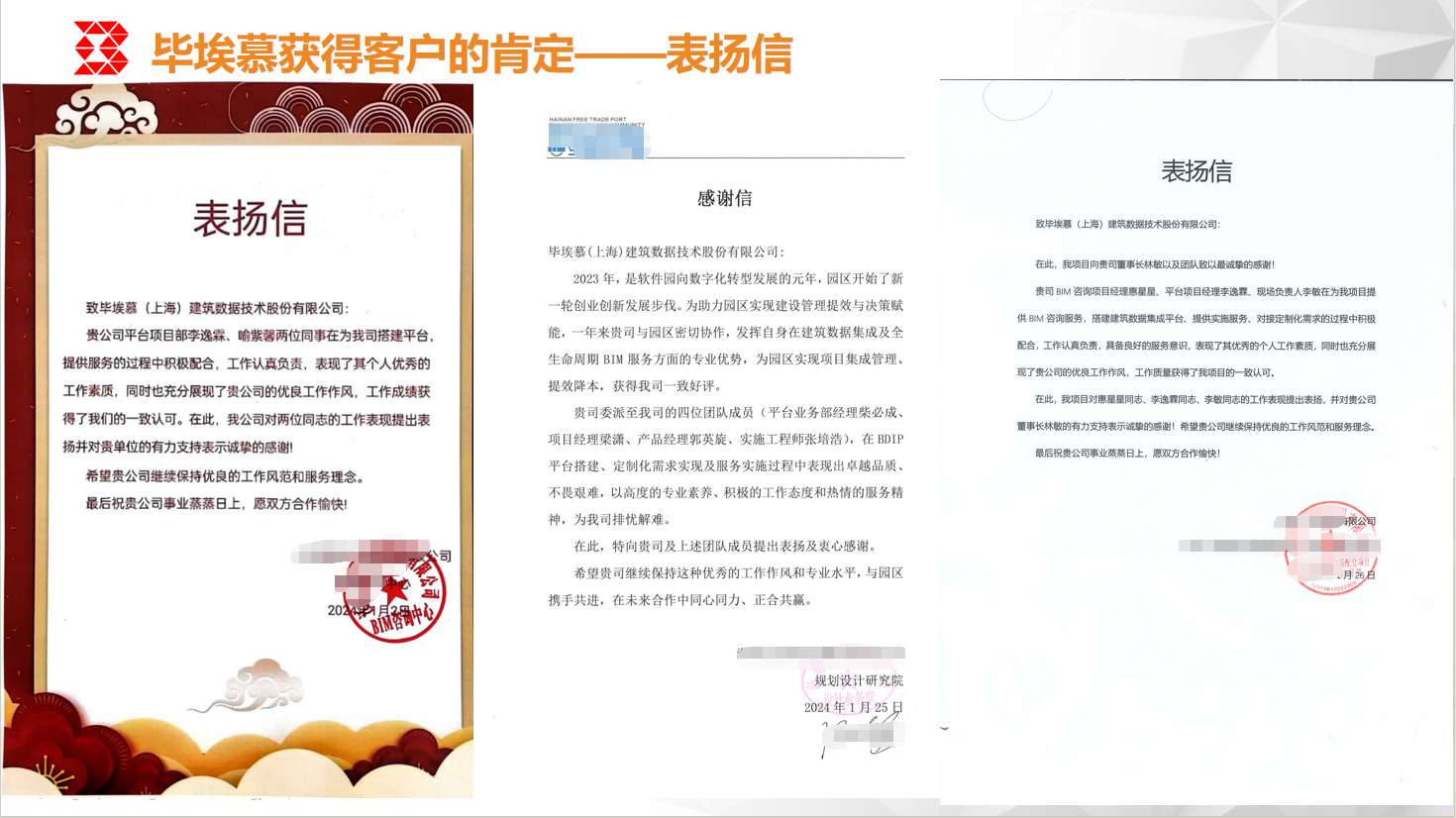 聚平凡,创不凡!毕埃慕2024年会成功召开,各地分公司也在不同地区分别举办。客户雪花一般发来的表扬信是我们最棒的年终奖励!保证每一个项目的成功落地,创造价值,是BDIP平台对客户的承诺!客户有价值我们才有价值!客户成功我们才能成功!行业下行,无惧挑战,创新应对,逆风才能更好的起飞!改变建筑这个被上帝遗忘的行业是我们这群平凡的毕埃慕人不凡的使命!