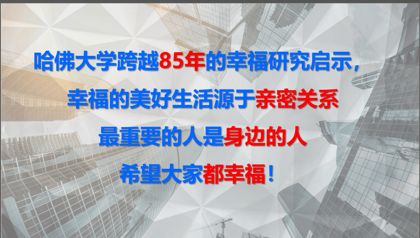 比起事业,声望和金钱,更影响一个人的长寿和身心健康的,反而是形成并维持良好关系的能力。是亲密关系。在所有关系中,亲密关系对成年后的幸福感的影响几乎是最大的。拥有一个值得信任的亲密伴侣会减少很多压力,但如果关系不稳定则可能导致强烈的痛苦、背叛感和批判性的自省。