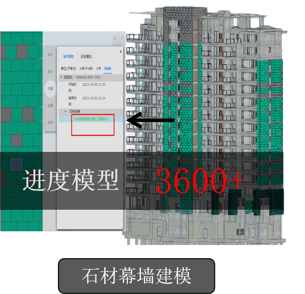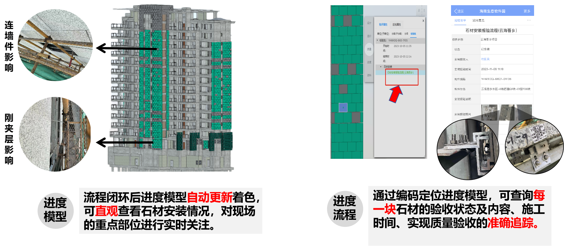 项目工程师利用BDIP平台上模型挂接流程的方式,达到能够用发起特定安装流程来 点亮进度模型的效果,即现场施工人员发起石材安装流程后,经监理及甲方查验通过后,定位在模型上的这一块石材亮起,管理人员可实时直观查看石材安装的进度。
