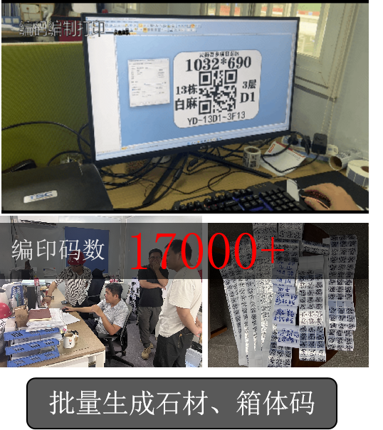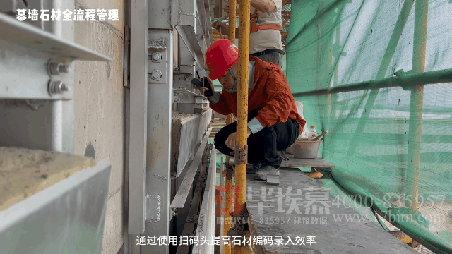 管理及施工人员可通过手机或电脑端BDIP平台的石材管理大台账查询到本块石材的规格尺寸、发货进度、场验情况、安装情 况等30余项信息。在流程跟踪过程中,我们通过使用扫码头提高石材编码录入效率,使 用打码机为石材厂商提供黏性哑银纸二维码 并附上石材基础信息如尺寸、安装位置等, 施工人员无需扫码就可直观的分辨石材,保证在数字化的进程中做到最大化的便利。