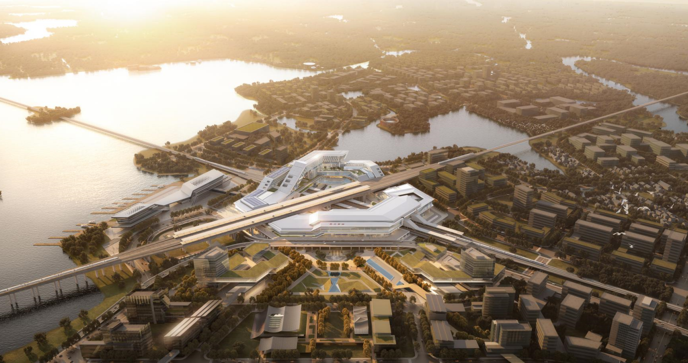 苏州南站(又名汾湖站)位于江苏省苏州市吴江区高新区境内,总建筑面积约35万平米。站台总规模4台12线(含正线4条)。沪苏湖和通苏嘉永两个车场呈十字交叉,沪苏湖铁路、通苏嘉甬车场规模均为两台6线。包含国铁站房、配套交通、综合商业等功能业态。
