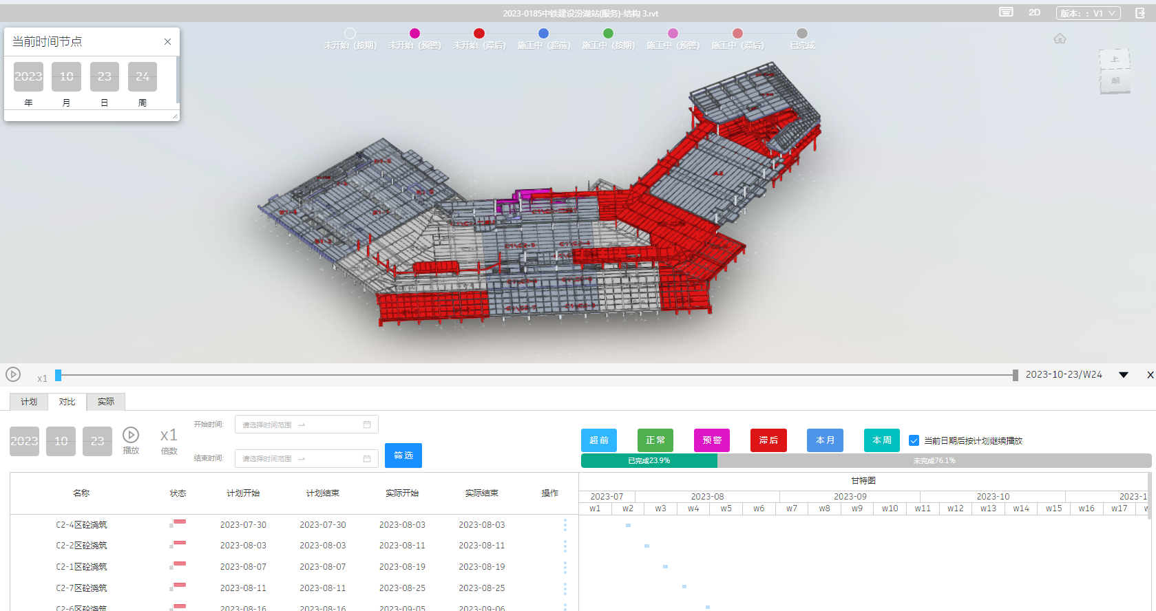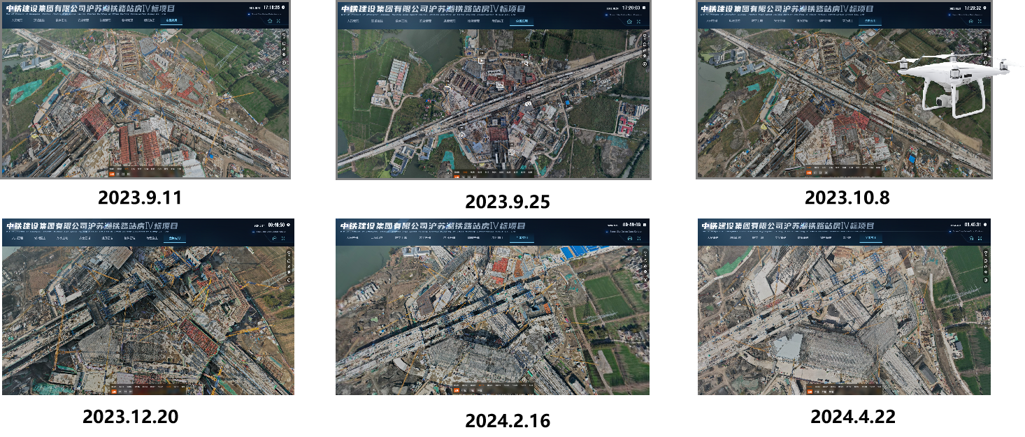 项目使用无人机进行航拍提供更直观、全面和高精度的项目现场数据。对于进度管理来说,无人机航拍可以帮助实时监测施工进度,并与建筑模型进行对比分析,以确定实际施工进度与计划进度之间的差异。(目前时间跨度23,7.18-24.4.22,每周一次)