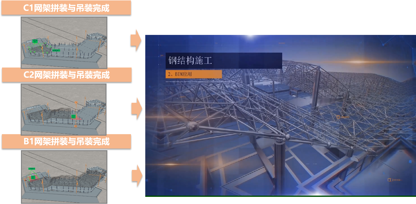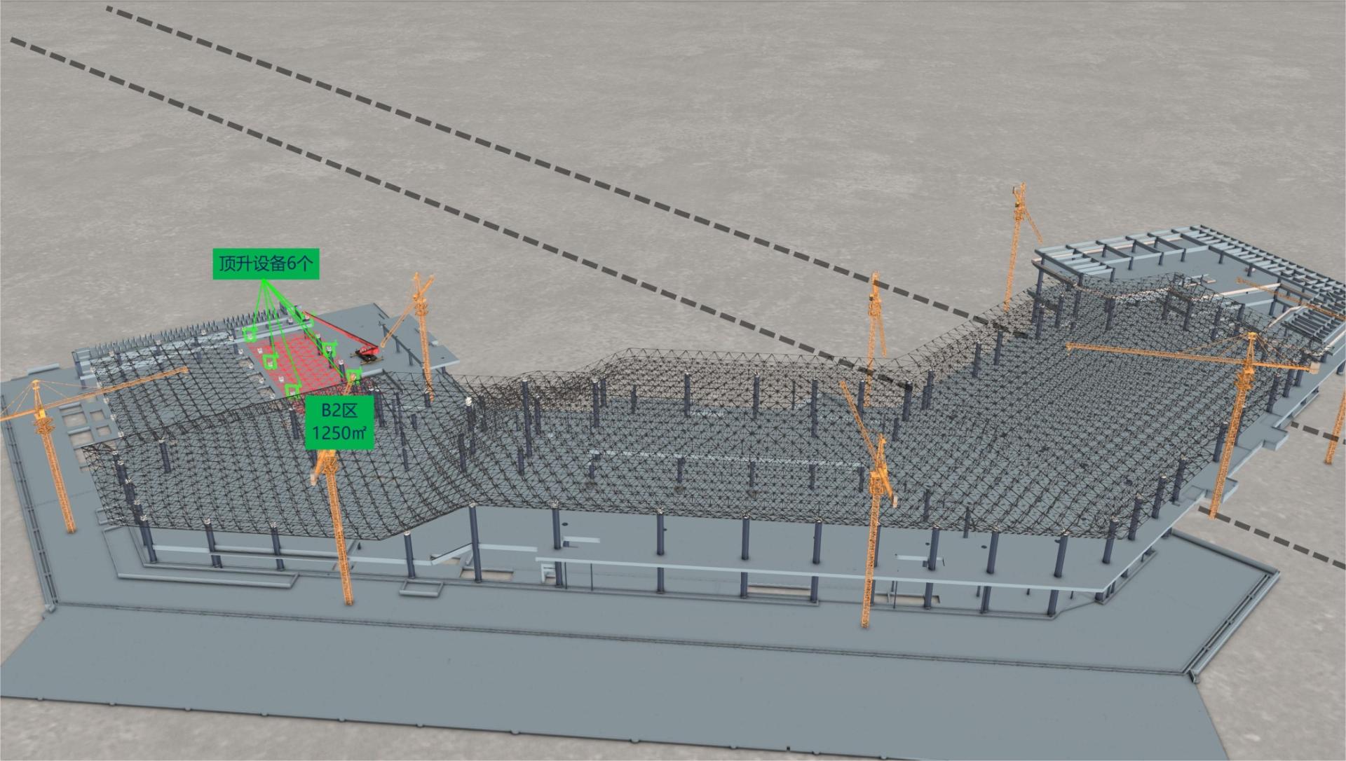 项目组织专项经专家论证,同时应用BIM技术对钢结构施工方案进行多方案模拟,在钢结构施工方案专家论证会议上,结合BIM技术,最终选取楼面分区分块原位拼装+超大型液压同步提升技术的施工工艺(桥下区域采用顶升工艺)的施工方案。BIM施工方案策划提高了施工组织,降低了施工成本,缩短了工期。