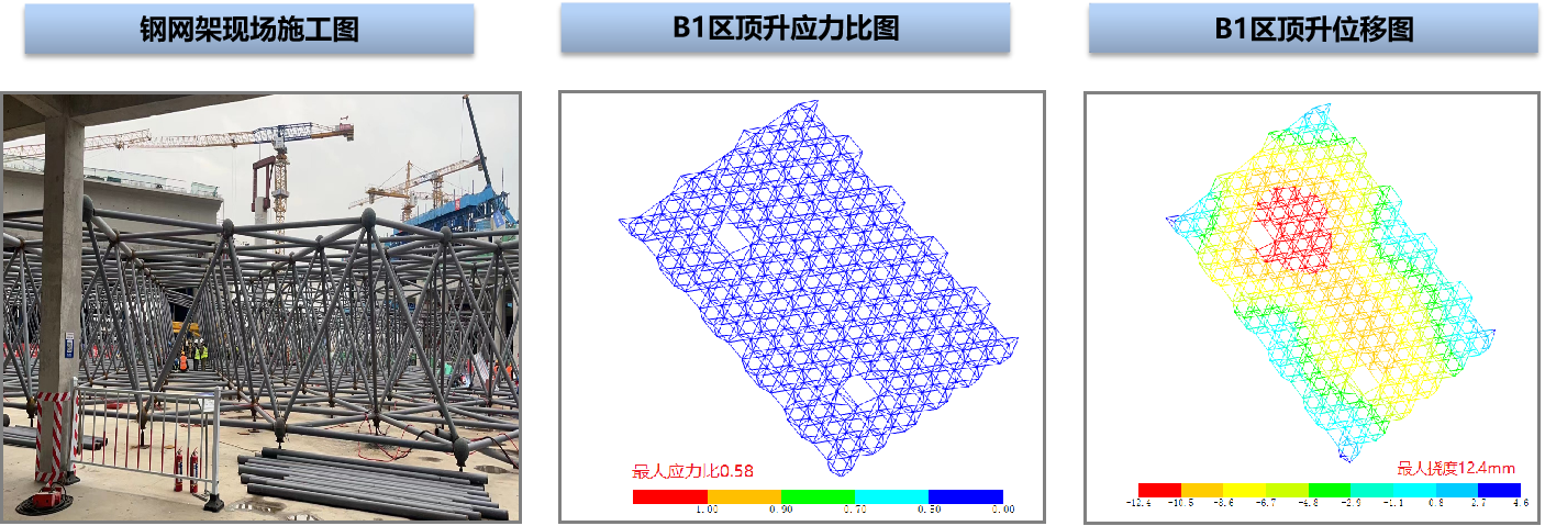 钢结构体量大,采用楼面分区分块原位拼装+超大型液压同步提升技术的施工工艺(桥下区域采用顶升工艺)