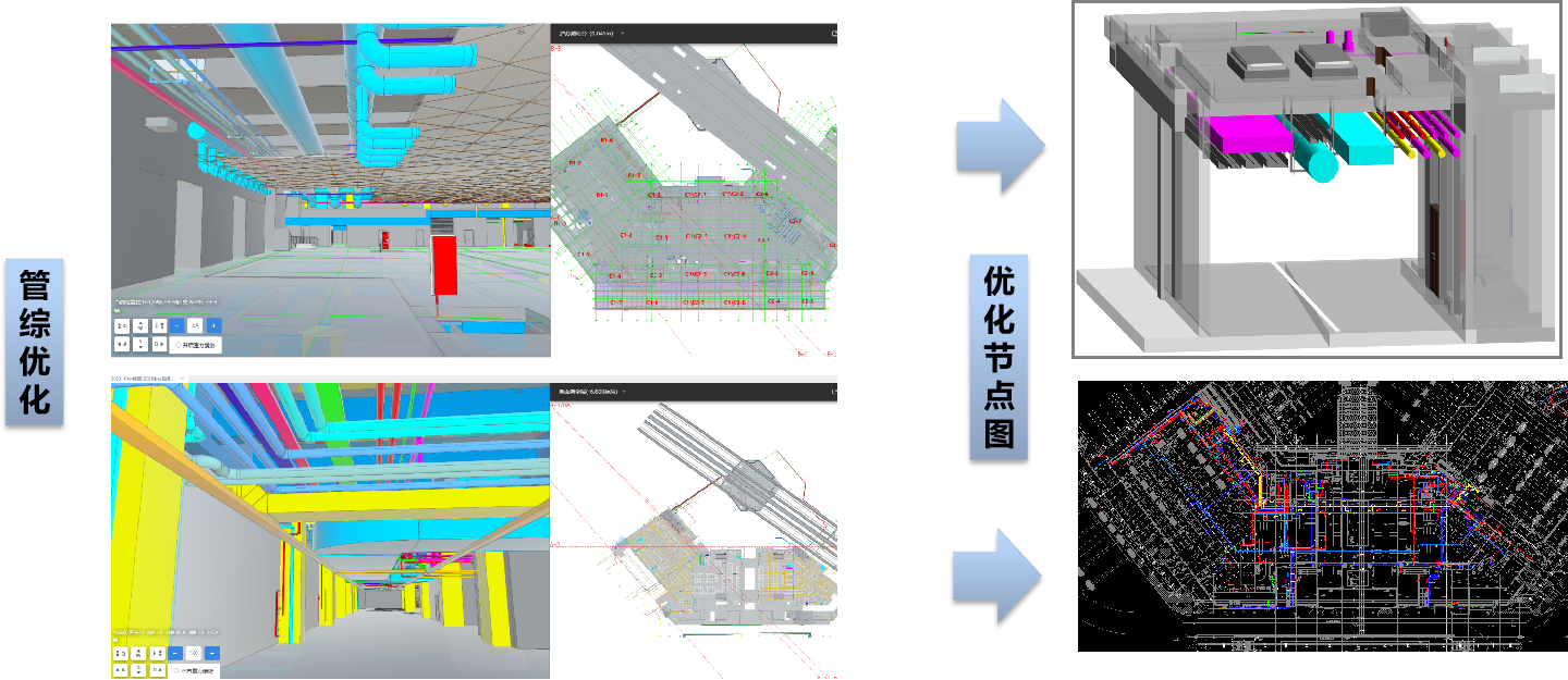 由于本项目涉及建筑功能繁多,机电管线复杂。对管线进行合理的翻弯与路径优化。方案定稿后,生成管综平面图,专业平图面,复杂区域剖面图,用于指导机电施工。