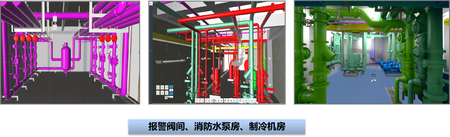 依据设计院图纸,BIM工程师对水泵房,风机房,冷冻机房,管井等位置进行碰撞检测,优化排布。根据碰撞报告,对机房管线二次深化设计,在施工前做好设备和管线的优化工作。