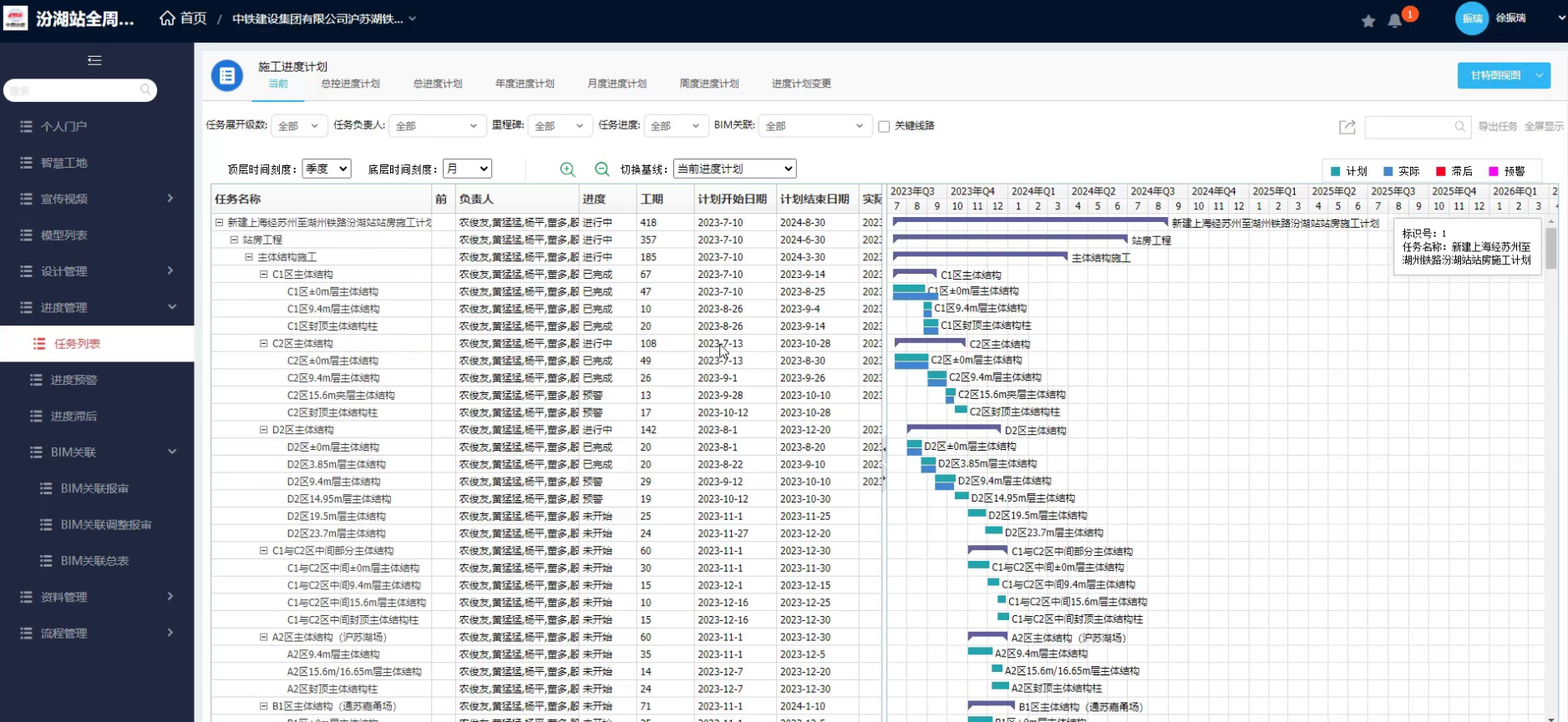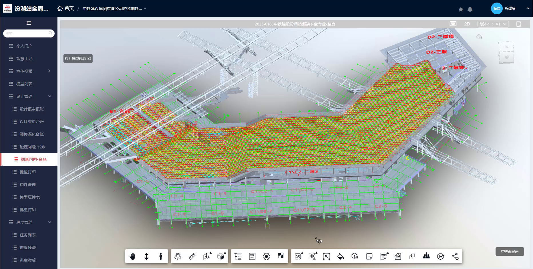 苏州南站站房项目部采用信息化施工管理平台,针对业主对标段整体进度管控需求以及项目部实现过程管理需求,研发并应用平台功能,包含模型轻量化查看,进度管理,资料管理,工程影像记录等功能。