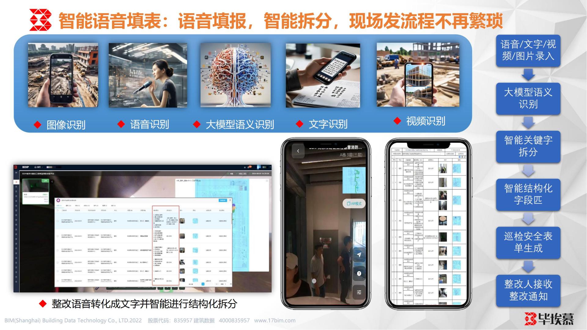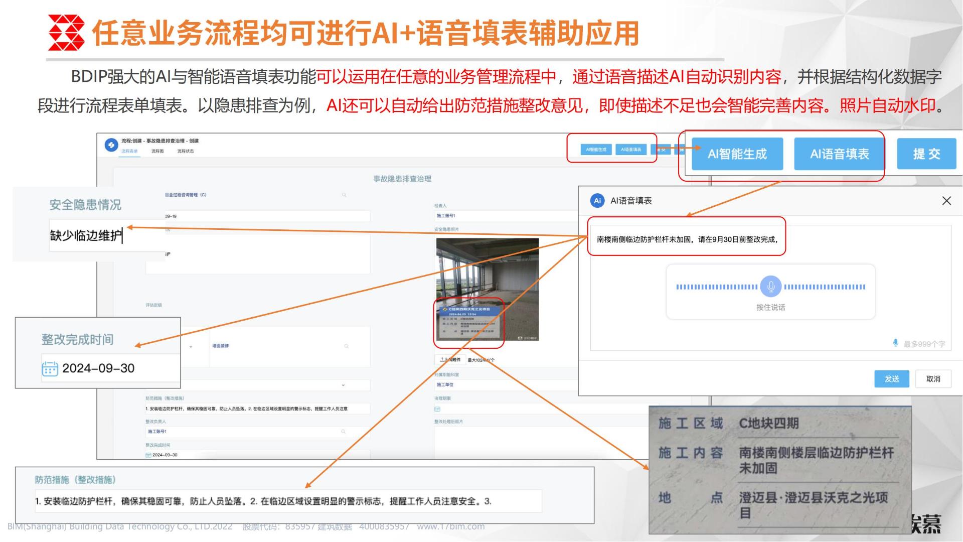 在BIM施工综合业务数据管理方面,BDIP强大的AI与智能语音填表功能展现出了卓越的优势。它可以运用在任意的业务管理流程中,通过语音描述AI自动识别内容,并根据结构化数据字段进行流程表单填表。以隐患排查为例,AI不仅能够自动识别隐患,还可以给出防范措施整改意见,即使描述不足也会智能完善内容,大大提高了隐患排查的效率和准确性。同时,该系统还具备照片自动水印功能,确保了数据的真实性和可追溯性。