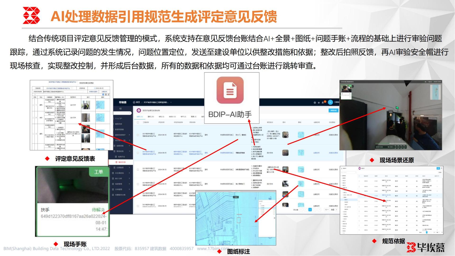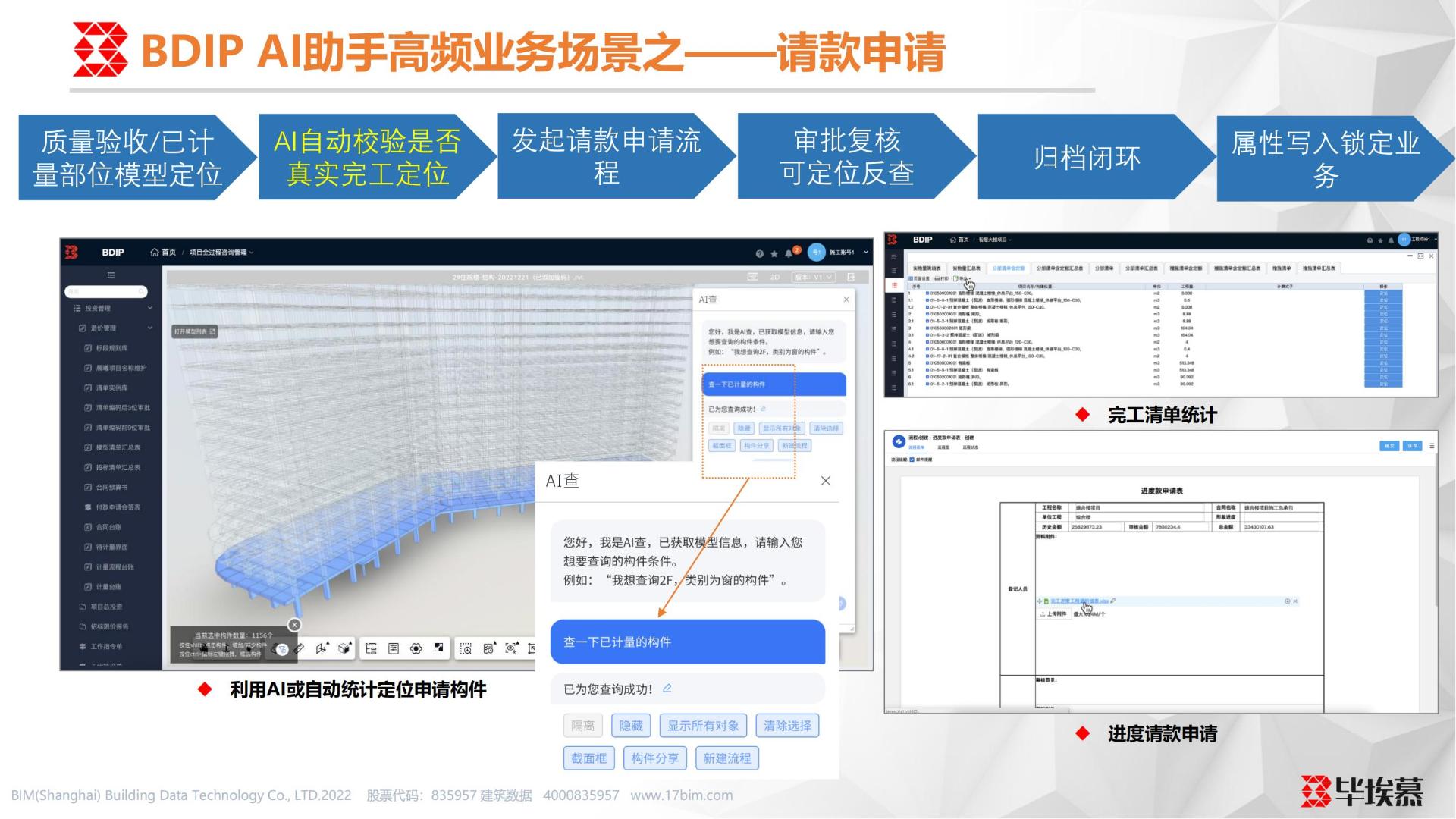此外,BDIP AI助手还涵盖了多个高频业务场景,如请款申请、图纸分析、质量验评和智能巡检等。在质量验评场景中,AI助手小毕能够自主识别场景,自动帮助操作人员执行相关动作,减轻操作人员的操作成本,提升平台的运用效率。在智能巡检方面,AI助手可以快速检索信息,定位构件,精准计算产值,为业主提供透明的费用依据,促进施工单位与业主之间的良好沟通。