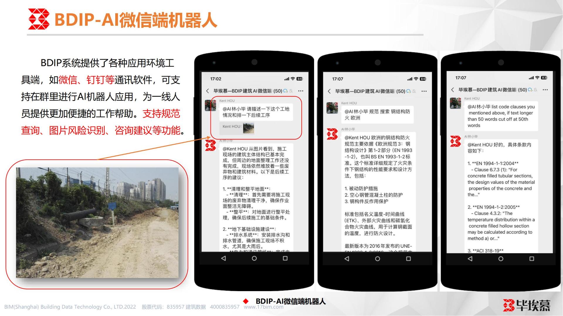毕埃慕公司带来的BDIP建筑数据集成平台更是成为了本次交流会的一大亮点。该平台的AI微信端机器人为工程一线人员提供了极大的便利。它支持在微信、钉钉等常用通讯软件的群里进行AI机器人应用,具备规范查询、图片风险识别、咨询建议等丰富功能,让一线人员在工作中能够随时随地获取所需信息,快速解决问题。