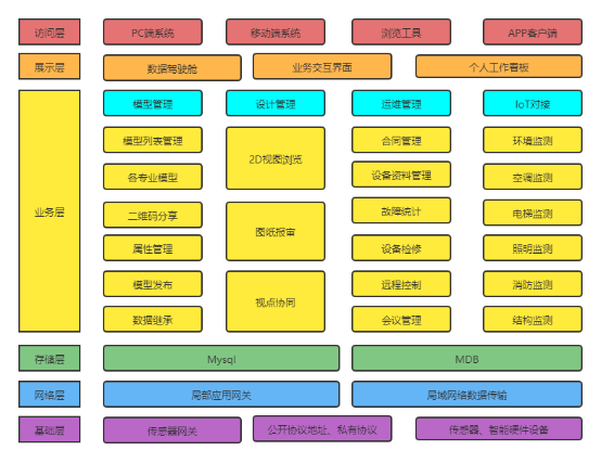平台采用多级网络层架架构,业主主要通过业务层的应用基于BIM模型对楼宇从设计、建设、运维全生命周期各阶段进行管控与维护。
