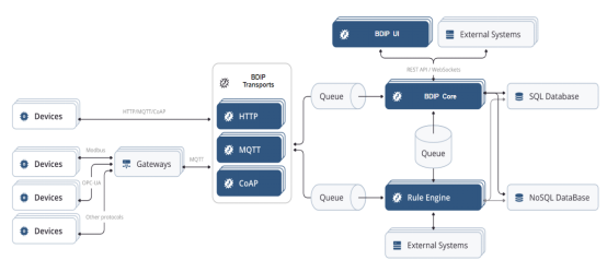 集成现场智能设备数据,Web端数据,APP移动数据在平台进行展示。将设备数据通过BA或MODBUS转换成HTTP或MQTT协议数据接入平台,同时平台可依据事先设定的规则与智能设备实现互动。